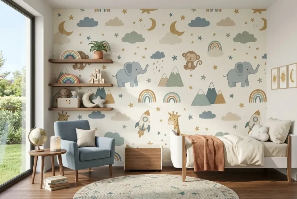 Create a magical space for your children with our kids’ room wallpaper collection. Featuring animated characters, jungle themes, outer space patterns, and playful geometric designs, all our kids’ room wallpapers are made with child-safe inks and materials.